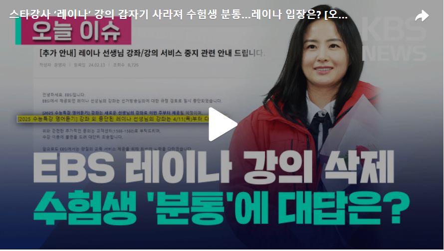 "레이나 선생님의 강좌가 선거방솜심의에 대한 규정 검토로 일시 중단됐다. 중단된 강의는 4월 11일 다시 제공된다." EBSi에 글이 올라왔다. 이에 수험생들이 돈 주고 산 책을 4월까지 썩히게 생겼다고 불만을 토로했다. 선거방송심의 규정에 후보자는 선거일 90인 전부터 선거일까지 보도와 토론방송을 제외한 프로그램에 출연하거나 후보자의 영상 등 출연 효과를 주는 방송을 할 수없다고 되어있다 영어강사 레이나 프로필과 현재 상황에 대해 알아보자.