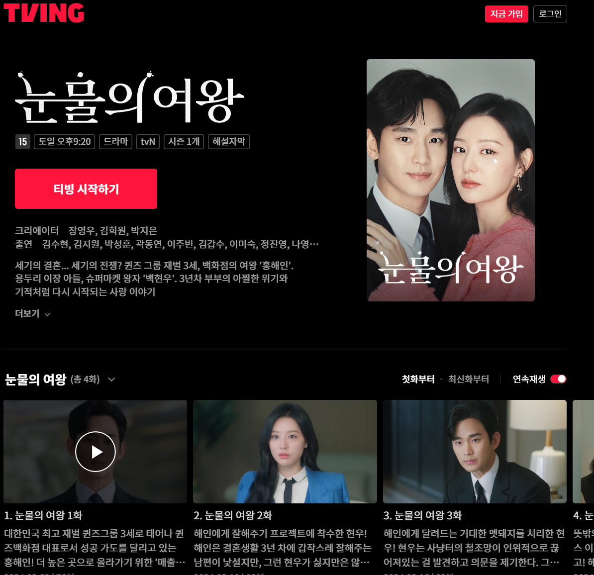 TVN 토일 드라마 눈물의 여왕에서 퀸즈그룹 재벌 3세 홍해인 역으로 돌아온 김지원은 용두리 이장아들 김수현과 결혼해 시한부 인생을 살면서 사랑을 회복하는 이야기로 다시 한번 시청자들을 추앙하게 만들고 있습니다. 회차가 공개될 때마다 김지원의 패션이 큰 관심을 끌고 있는데요, 대당 드라마는 TVING에서 바로 보실 수 있습니다. 또한 방송 알림을 신청해 놓으면 TVN 재방송시간에 맞춰 무료로 시청하실 수도 있습니다.