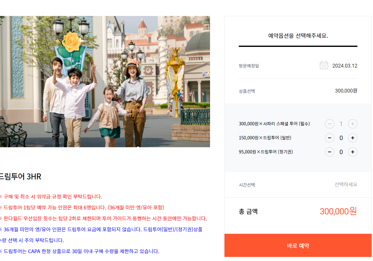 - 기본상품구성 : 전용주차장, 투어가이드 파크동행 서비스, 정문게이트 우선입장, 랜드마크 기녕촬영, 인기 어트렉션 우선탑승, 사파리 스페셜 투어, 레스토랑 식사